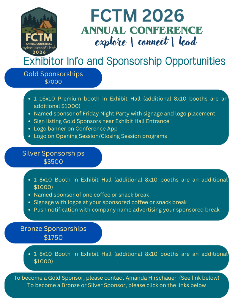 The FCTM annual conference is Florida’s premier math professional development event, drawing over 600 educators annually. Read below to learn how you can engage in our 2026 Conference or email Amanda Hirschauer-Ayres at amanda.hirschauerayres@osceolaschools.net.